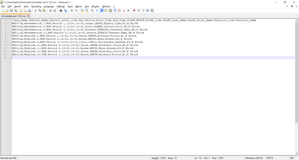 Example of OneStudent – Import Data page – Download CSV option (Timetable) in Notepad++: