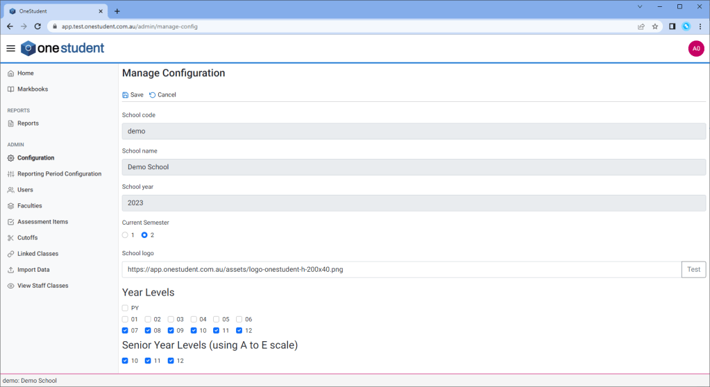The Configuration – Manage Configuration page allows the Administrator user to configure various settings for the school. For example, the School Code, the School Name, add a Logo and select the Year Level OneStudent will be used for.