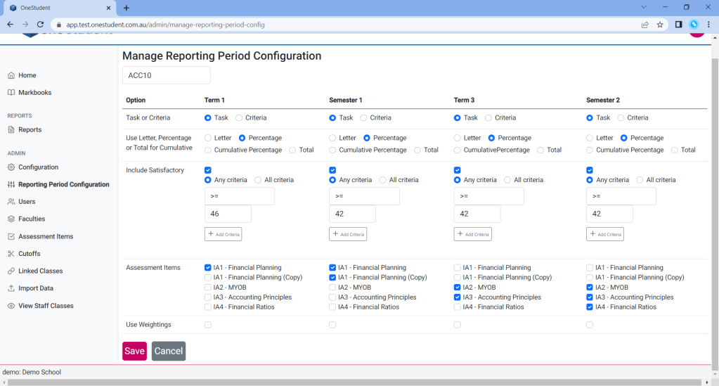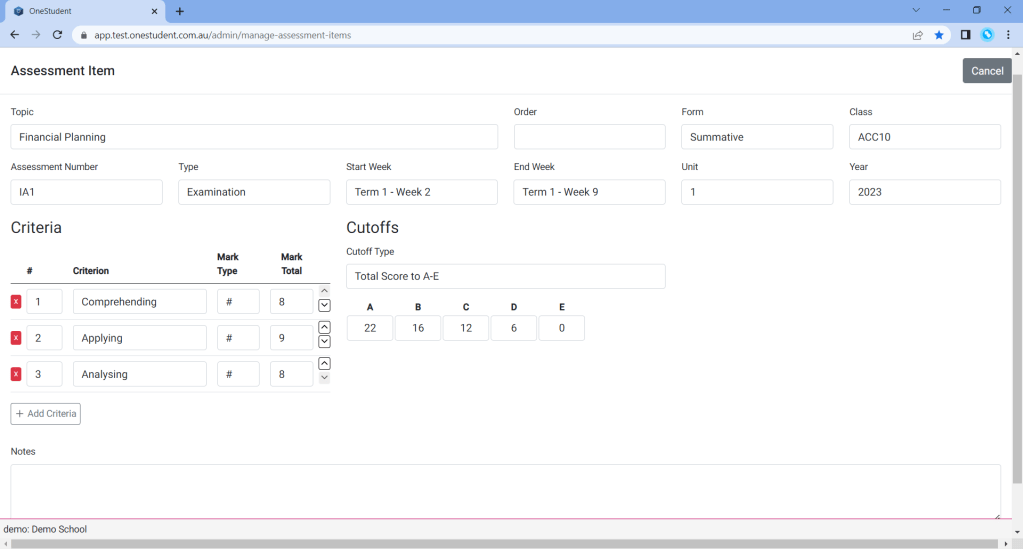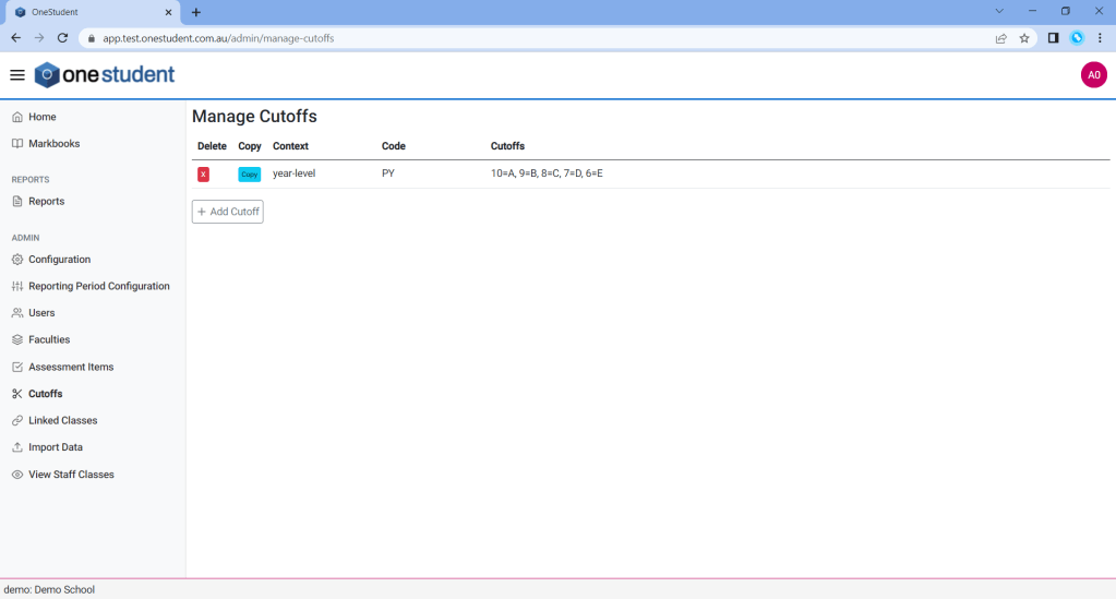 Each assessment item is assigned a cutoff, and by default the hardcoded percentage values within OneStudent are applied.