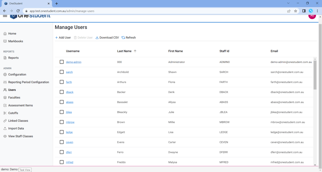 The User – Manage User page allows the Administrator to manage the list of users that have access to OneStudent. For example, updating email addresses for an to individual users, or deleting a user that is no longer part of the school faculty.