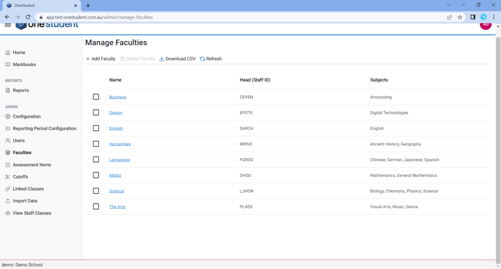 The Faculties – Manage Faculties page allows the Administrator to manage the list of faculties at the school. For example, assigning the Head of Departments to their individual faculties or deleting a faculty that is no longer offered at the school.