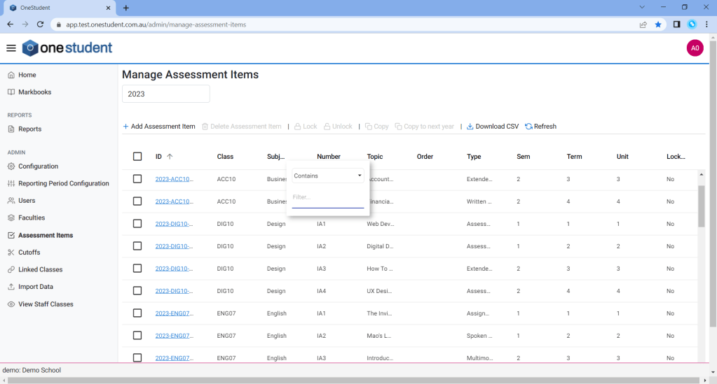 Example of OneStudent – Assessment Items – Manage Assessment Items page: