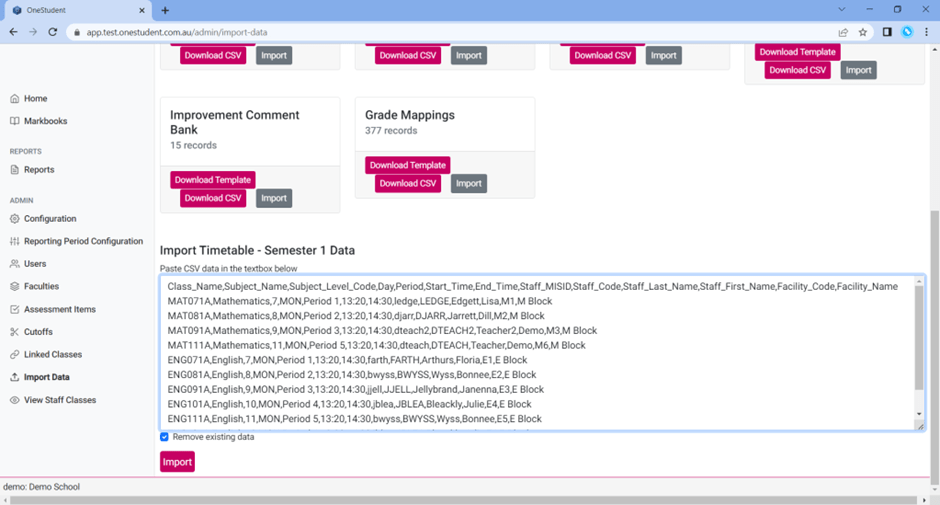 The Import button can be used to import CSV data for the selected option, for example data gathered from other systems like OneSchool.