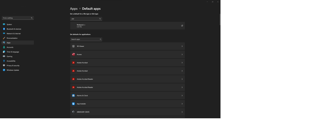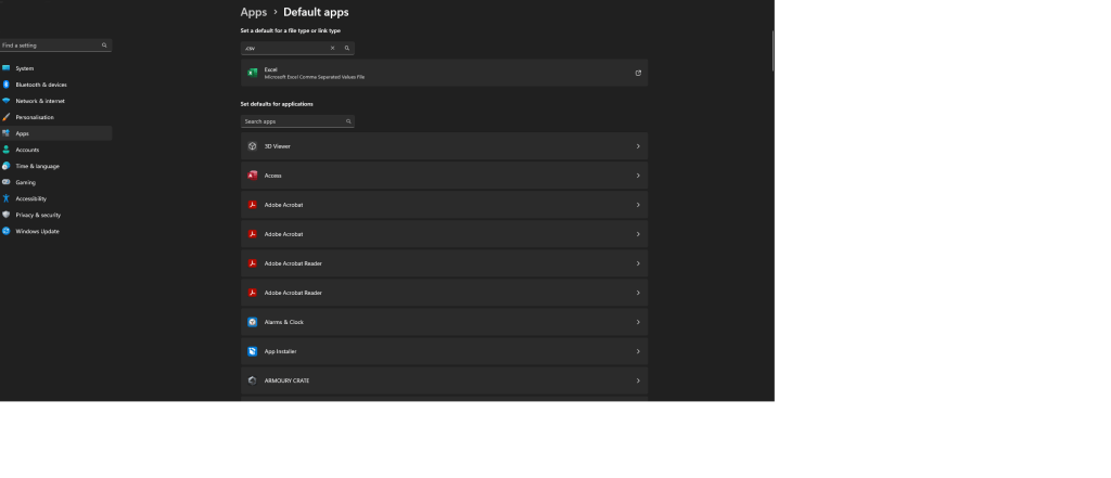 Within Default apps Search “.CSV” this will display that excel is the default