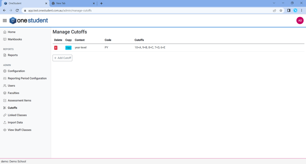 Each assessment item is assigned a cutoff, and by default the hardcoded percentage values within OneStudent are applied.