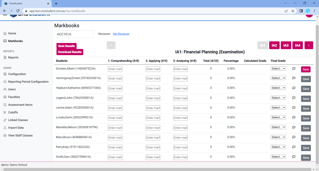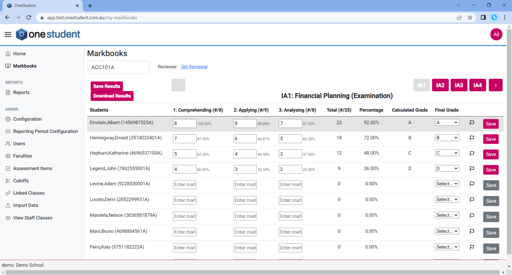 Example of OneStudent Markbooks page with Class selected (ACC101A), tab 1 (IA1) and data entered (Top 4 rows), data is captured: