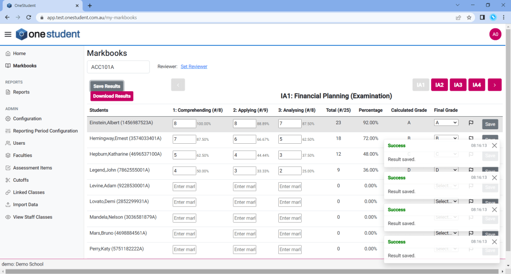 Example of OneStudent Markbooks page with Class selected (ACC101A), tab 1 (IA1) and data entered (Top 4 rows), data is entered and saved with Success messages displayed: