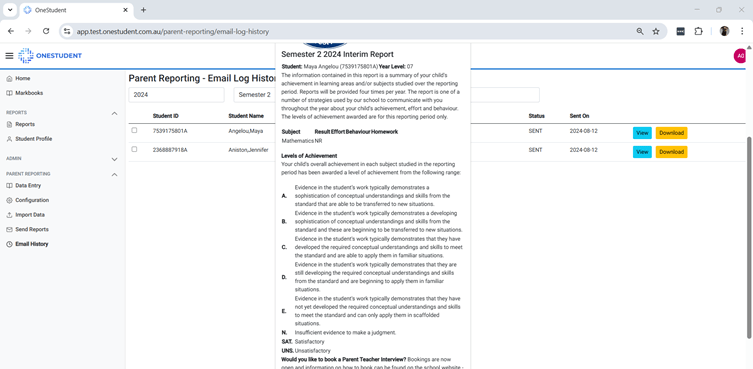 NOTE: The Download option will save the report as a PDF. These reports can be fully customised to include your school’s specific requirements. The example shown here is for demonstration purposes only. Please speak with the OneStudent team to have your customised report set up, including elements such as your school logo and any other required information.