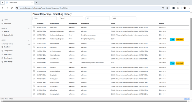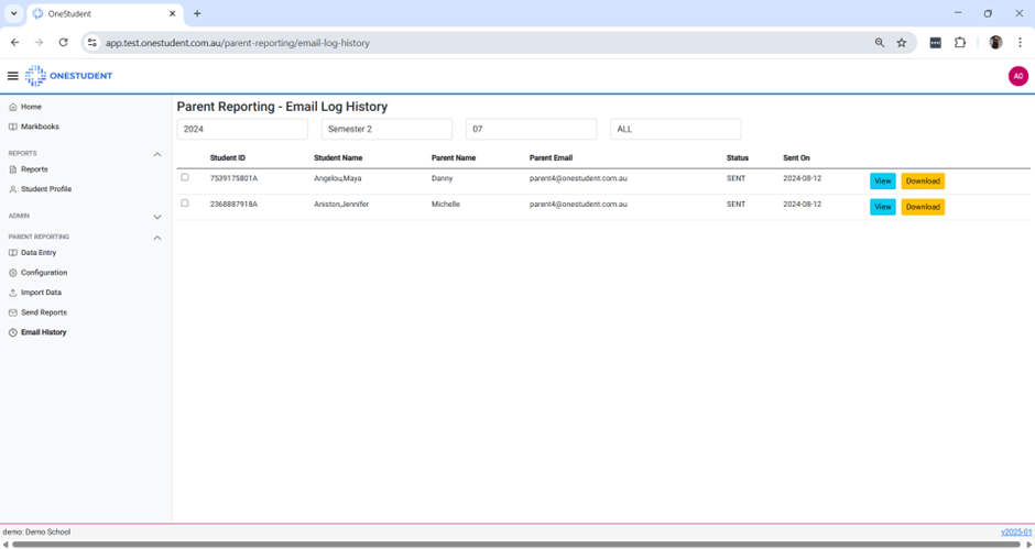 Example of OneStudent Parent Reporting – Email History page use View to open the report on screen for Year Level 07: