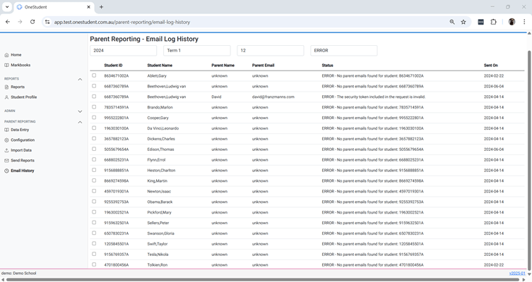 Provides a complete log of all Parent Report emails sent through OneStudent. Key features include:
