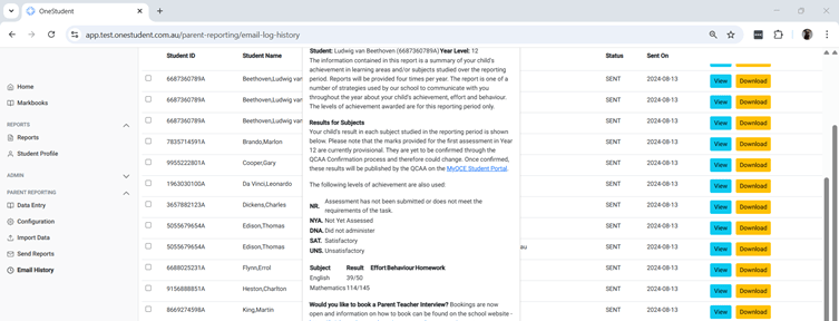 Example of OneStudent Parent Reporting – Email History page use View to open the report on screen for Year Level 12: