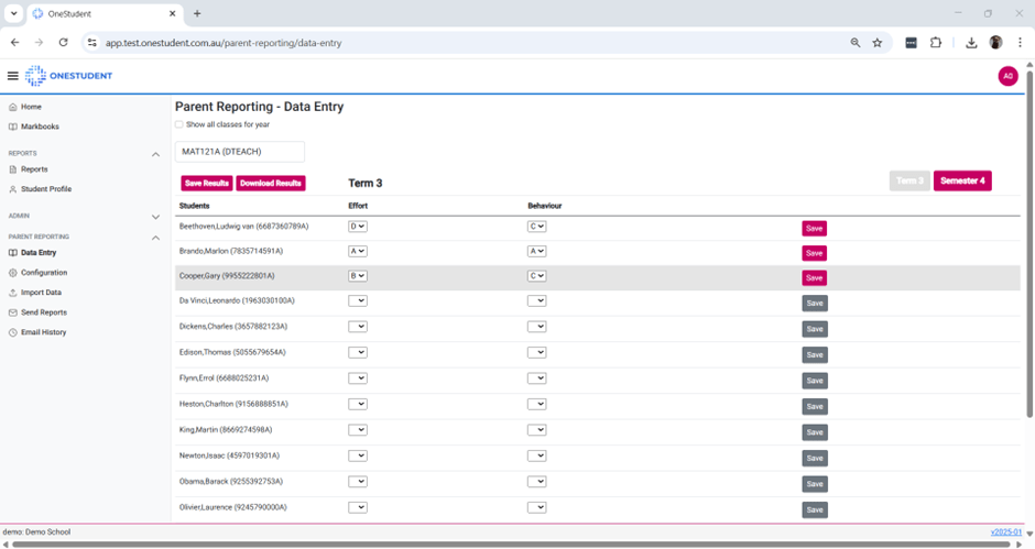 - Data Entry Area: The remainder of the page is used for data entry. This is where Effort and Behaviour results are recorded for each student. The Save option becomes available once results have been entered.