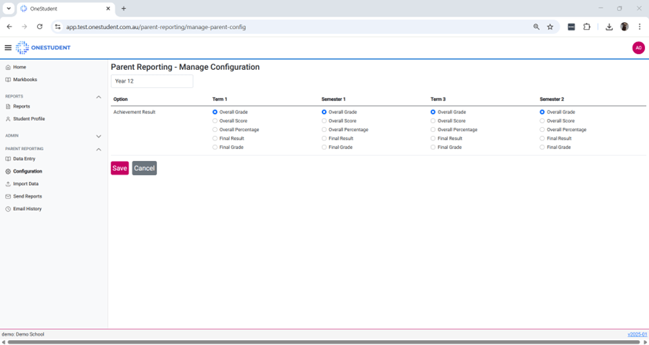 Used to set the Year Level Achievement Result options for each reporting period (terms or semesters). Schools can choose the type of achievement outcome to display in the Parent Report, including: