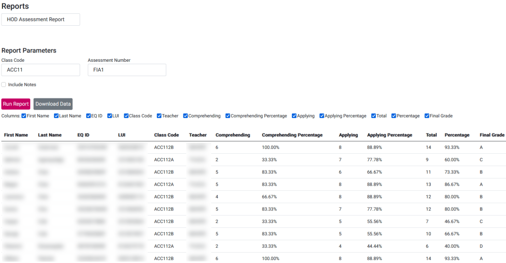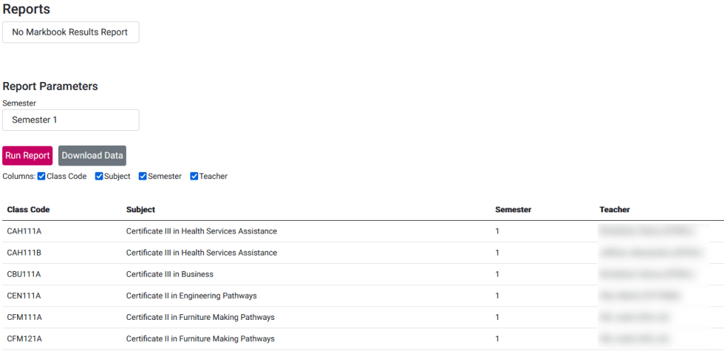 Report to download the markbook results for a given class code.