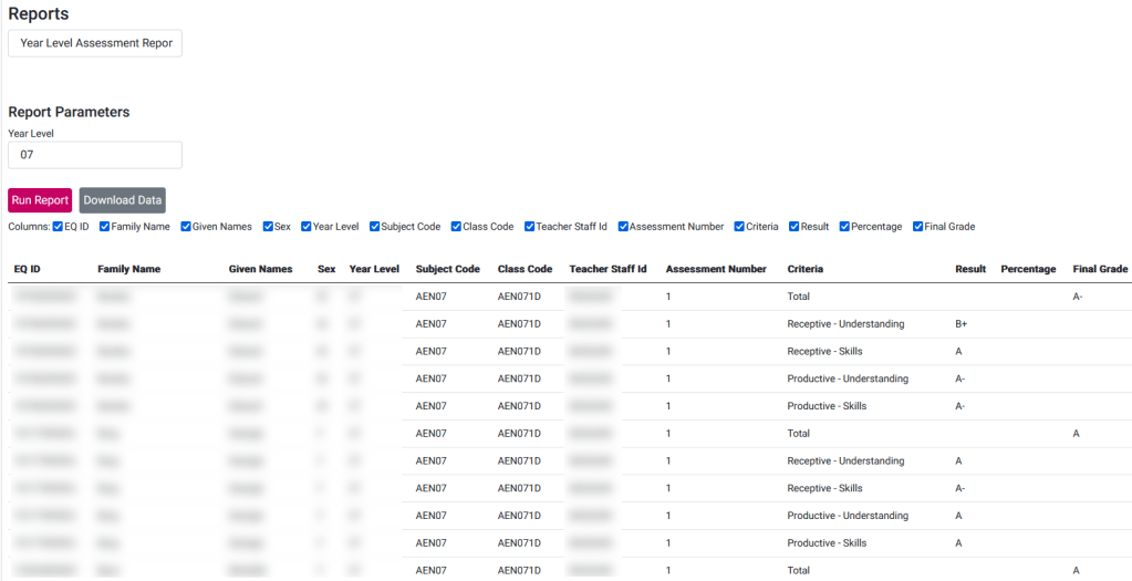 Report to download all the markbook results for a given year level.