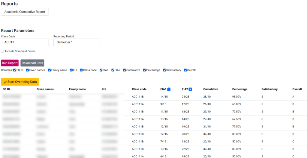Report that cumulates the academic results for a given class code and reporting period (Term 1, Semester 1, Term 3, Semester 2).