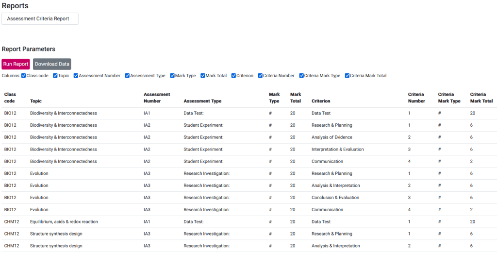Report to download all the assessment items and their criteria.